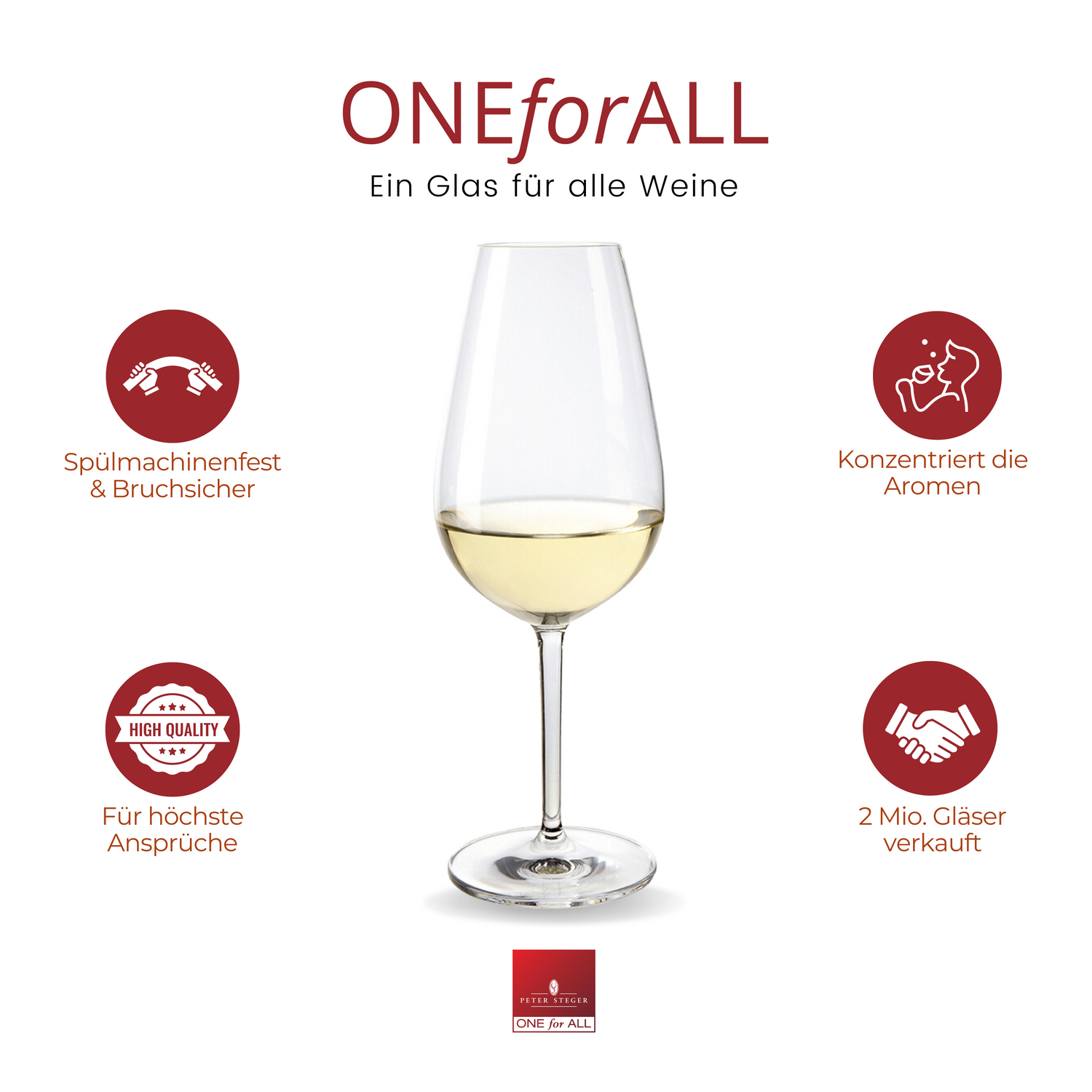 Eine Glasform wie ONEforALL kann man sich nicht ausdenken - sie muss entwickelt werden! Dieser Prozess dauerte mehr als zwei Jahre. In über 80 Verkostungsrunden entstand aus einem Grundmuster die Evolution und schließlich das finale Glas. Hunderte Weine wurden immer wieder neu verkostet - aus dem jeweils weiter entwickelten Glas. Viele Sommeliers und Winzer trugen zu einem objektiven Ergebnis bei. Das Glas ist im unteren Bereich bauchig gestaltet, damit der Wein auf einer großen Oberfläche möglichst viel Sauerstoff bekommt, um seine Aromen freizusetzen. Die schmale Öffnung bündelt die Aromen und bringt das Getränk automatisch auf die Zungenmitte, sodass es sich optimal im Mund verteilt. Beide Größen eignen sich hervorragend für den Genuss aller Weiß-, Rot-, Rosé, Schaum- und Süßweine, aller Rebsorten, Herkünfte und Altersstufen sowie von klaren und fassgereiften Spirituosen. Ich empfehle das kleine Glas als professionelles Verkostungsglas und bevorzugt für Champagner, Sekt, Weiß-, Rosé-,Schaum- und Süßweine, Sherry, Port und hochwertige Spirituosen. Das größere ist ein hervorragendes Genussglas und unterstützt besonders die Aromenentwicklung von Rotweinen, großen Weißweinen und besonderer Schaumweine und Champagner.